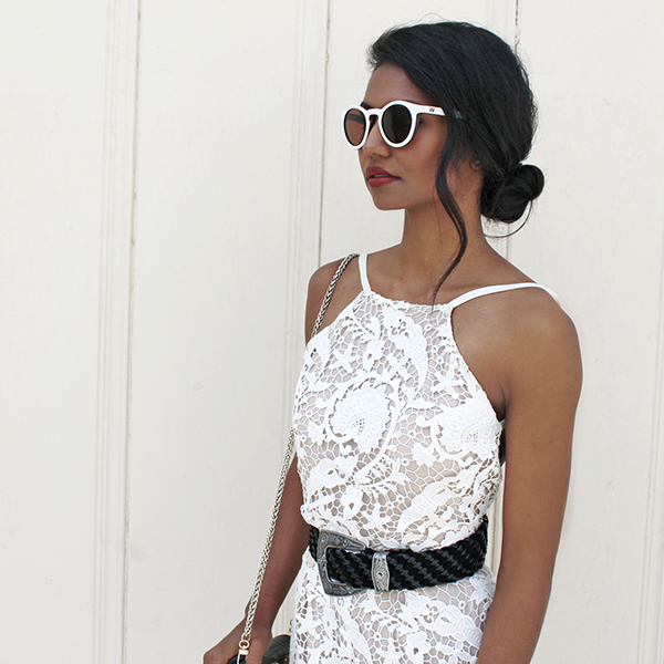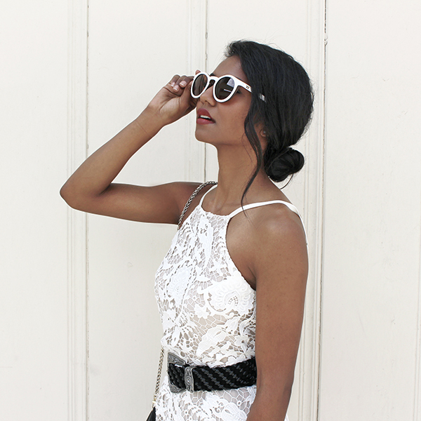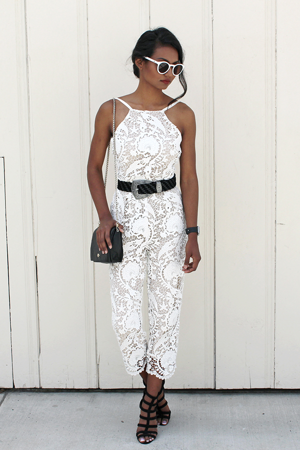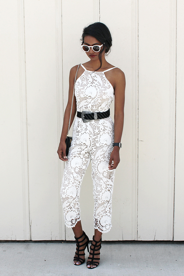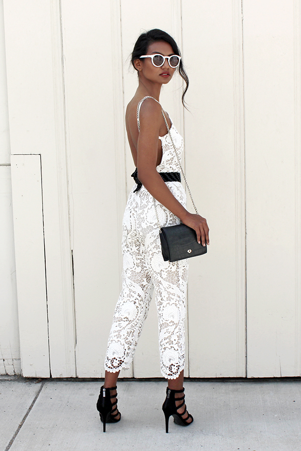 Outfit Details: Stone Cold Fox Lace Capri Jumpsuit, Woodzee White Sunglasses, Mary Lai AVA Clutch, Express Runway Heels
