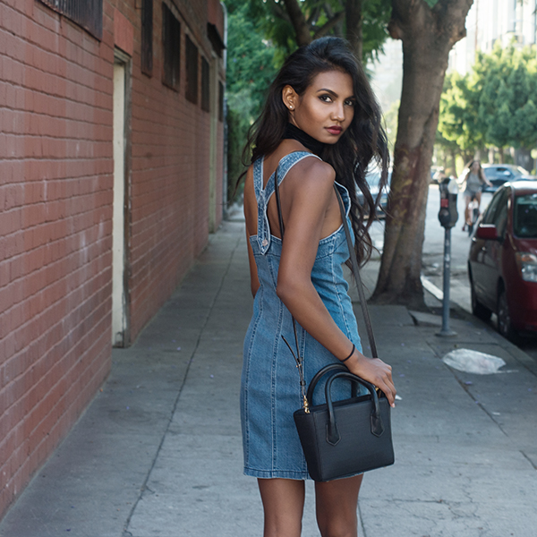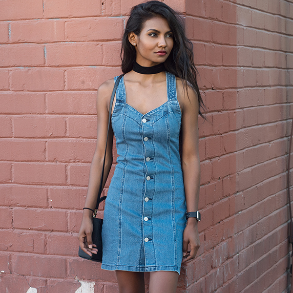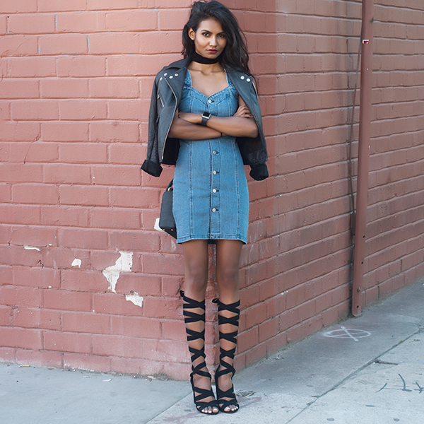 Outfit Details: ASOS Denim Dress, Missguided Lace up Heels, Nasty gal Leather Jacket