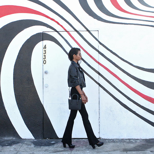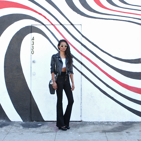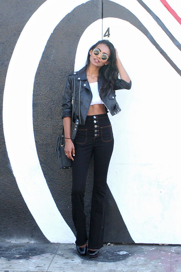 Outfit Details: ASOS High Waisted Button Up Flare Pants, Nasty Gal Leather Jacket, Ray Bay Rounded Sunglasses, Dagne Dover Mini Purse