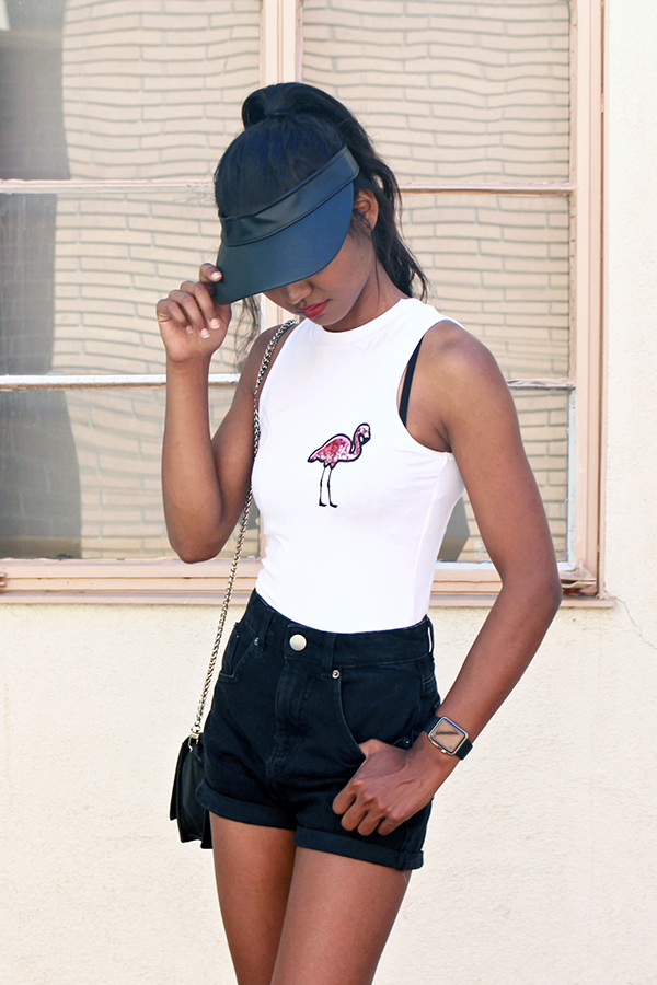 Outfit Details: Flamingo Sequin Bodysuit (similar), ASOS Denim Shorts and Black Leather Visor ![]() Post Script. lookbook | tumblr | chictopia | bloglovin | facebook | instagram |