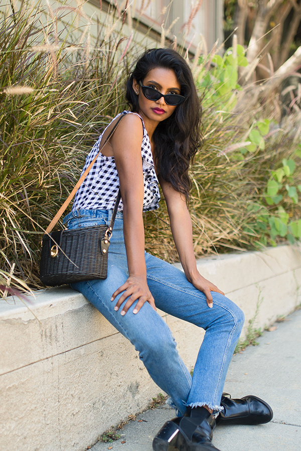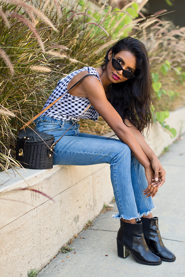 Outfit Details: Pretty Little Thing Gingham One Shoulder Bodysuit, ASOS Mom Jeans