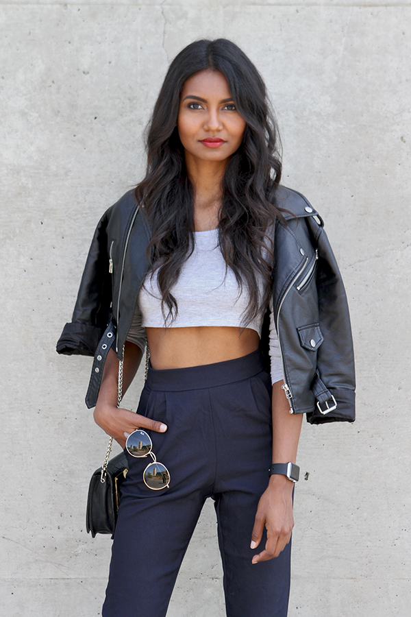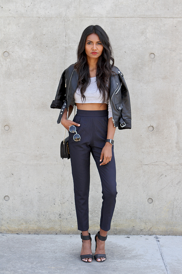 Outfit Details: Lulu’s High Waisted Trousers, ASOS Gray Crop Top, Nasty Gal Leather Jacket, Dagne Dover Mini Tote